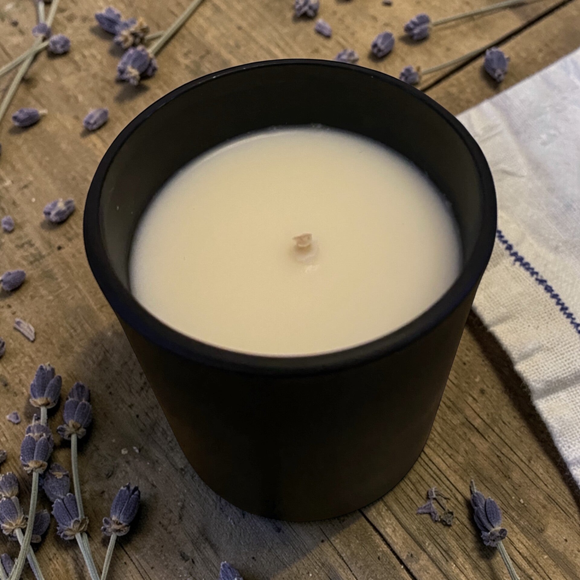 Bougie artisanale coulée à la main au cœur de La Chaux-de-Fonds. Parfum de Grasse. Cire de soja. Mèche en coton. Contenant céramique noire 200g avec couvercle en bois.