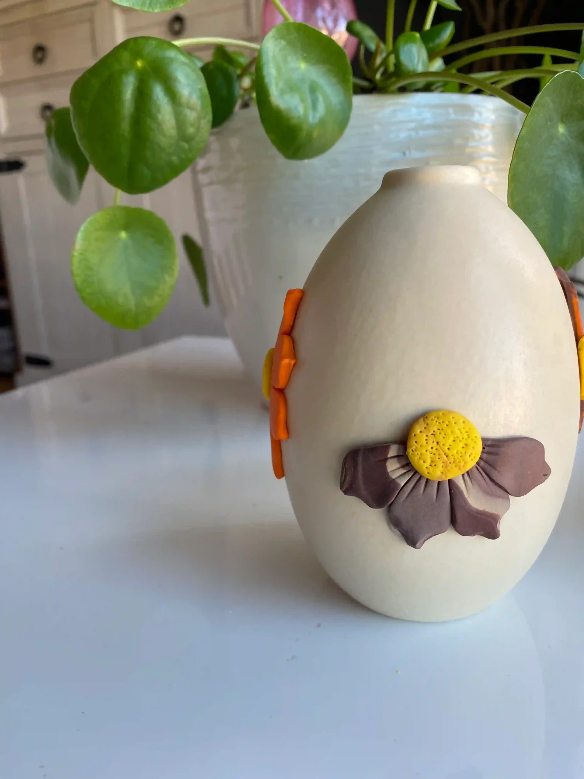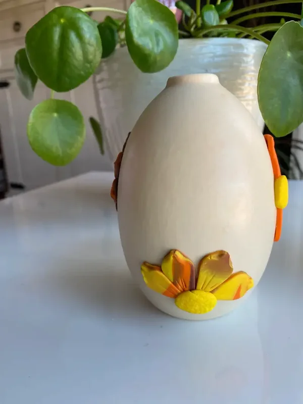 Un vase beige tout en douceur, habillé de demi-marguerites façonnées à la main en pâte Fimo. Brun, orange, disposées de façon irrégulière tout autour — comme si les fleurs avaient choisi leur place elles-mêmes.